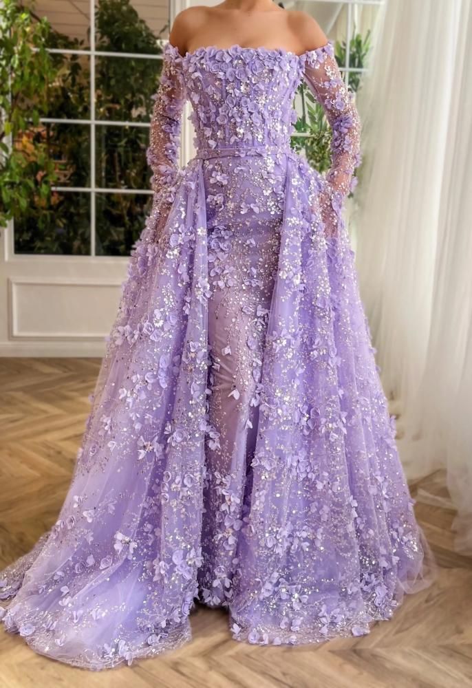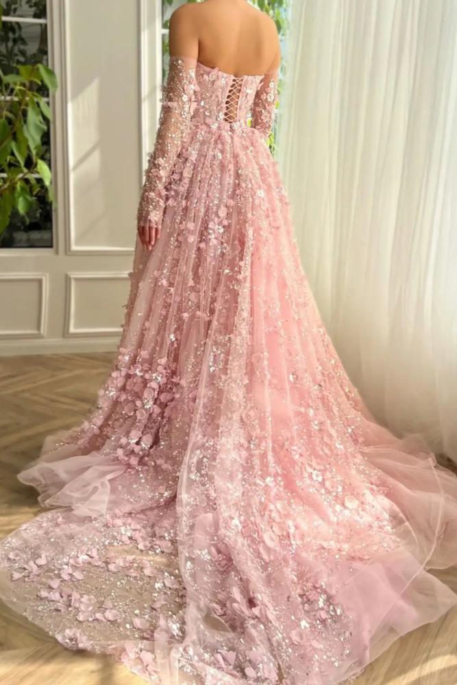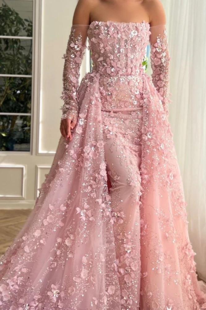 فستان سهرة وردي شك تطريز بأكمام طويلة